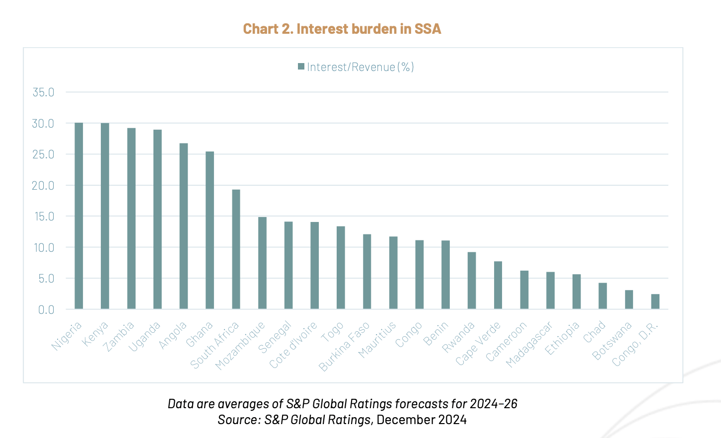 Les lourdes charges d’intérêts sont souvent citées comme une contrainte majeure pour la notation des pays d’Afrique subsaharienne. Une base de recettes étroite, combinée à des coûts d’emprunt élevés, a fait grimper les ratios service de la dette/recettes publiques à des niveaux très élevés dans certains pays. Plusieurs États, dont le Nigeria, le Kenya et la Zambie, consacrent plus d’un quart de leurs recettes publiques au paiement des intérêts.
